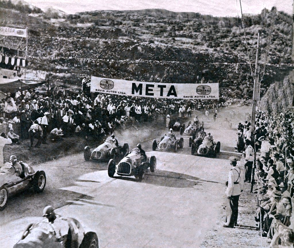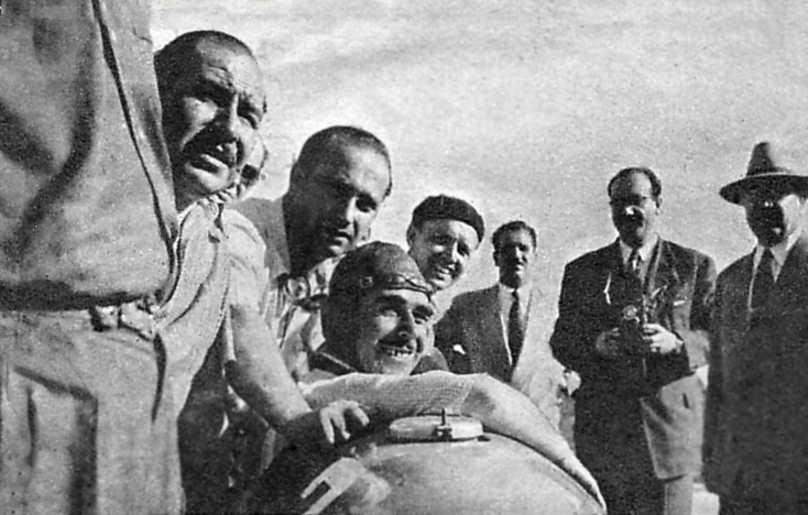 En la foto inferior se ve a Ismael González precisamente durante los momentos previos a la largada de esa histórica prueba, en compañía de nada menos que del quíntuple campeón del mundo Juan Manuel Fangio y del propio Bartolomé Ortiz (sentado en el cockpit de su monoposto), quien fuera campeón nacional durante varios años.