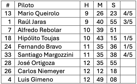 De ahí hacia el norte —Victoria, Malleco, Cabrero— Ibarra siguió dominando los tramos rectos con una superioridad que parecía “de otra galaxia”. Jaras, sólido, reafirmaba su condición de N°1 del país. Y Queirolo, paciente y rápido, iba construyendo su propia victoria: la de Turismo Carretera.
