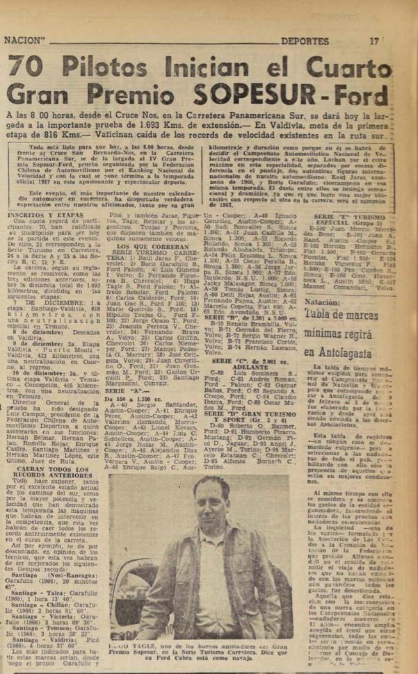 Se inscribieron 70, pero hubo bajas grandes antes de largar. La más comentada: Germán Picó, inscrito en un Jaguar, no corrió. También se restó Humberto Pizarro (venía desde Perú). Esos nombres importan porque en 1966 Picó había sido el símbolo del “auto moderno” dominando a los monstruos; y sin él, 1967 quedaba servido para una pelea más “terrestre”: la de los Ford y los Chevrolet, con un Mustang que venía anunciando tormenta.