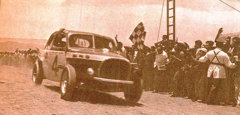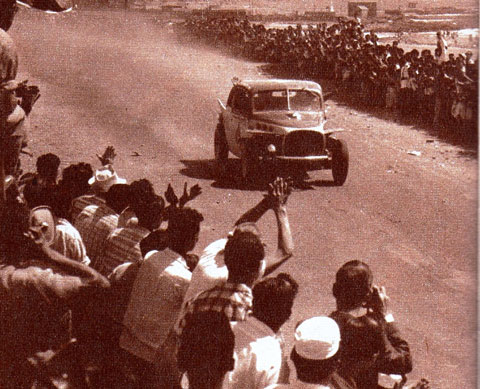 La revelación de la carrera: el joven alemán Peter Kube y su rápido Volvo (con el letrero de Copiapó en el techo), llega a la meta en Antofagasta tercero, provocando la expectación y júbilo de los miles de espectadores situados a la orilla del mar.