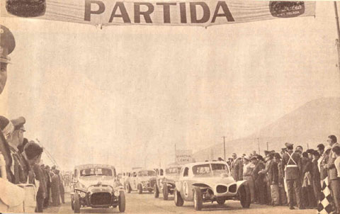 La largada del Gran Premio a la salida norte de Santiago, con dos Chevrolet en la primera línea: el N°1 del argentino José Maimone y el N°2 de Eugenio Velasco Letelier.